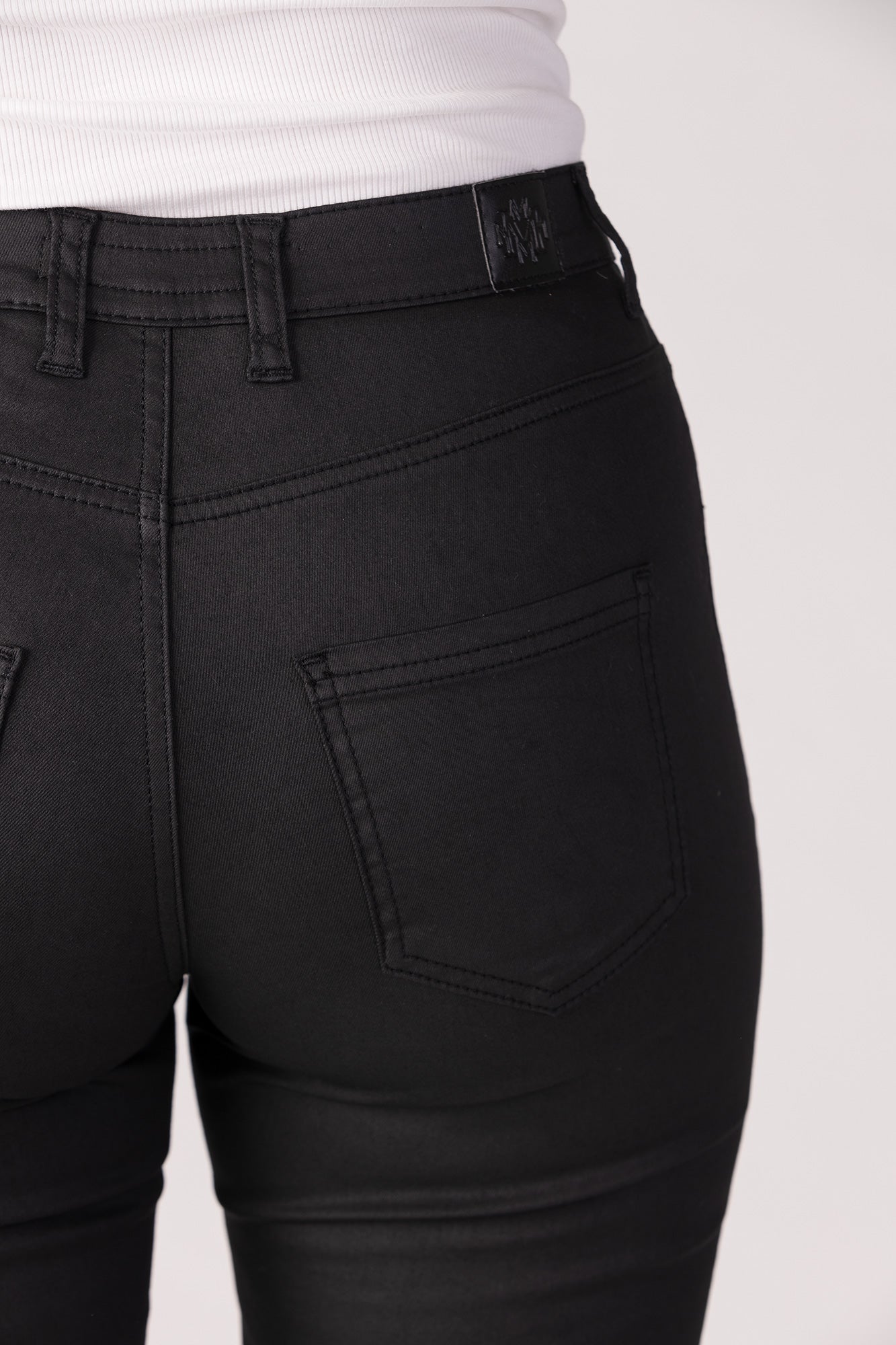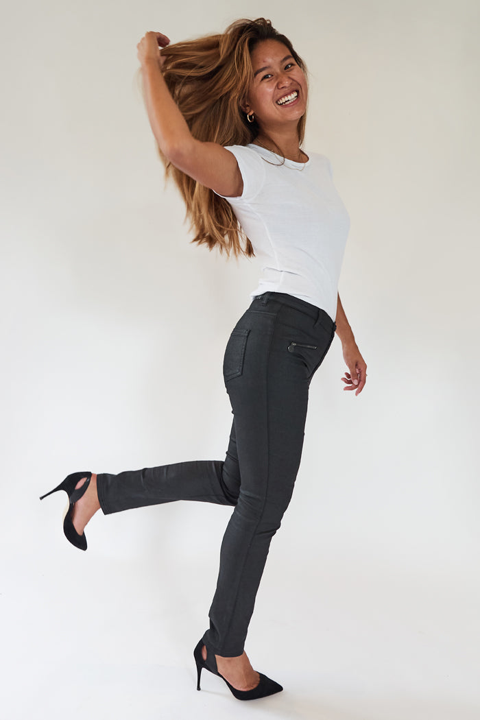 15639-439-09 / Slim - Sort Coated, er en tætsiddende buks i en behagelig og let coated stofkvalitet, med imiteret skind look. Den er lavet i vores velkendte og gennemtestede stof med superstræk, der holder formen og farven vask efter vask. Den gode kvalitet gør, at bukserne holder formen så man undgår knæ eller at de bliver større i løbet af dagen.